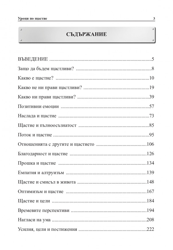 Опитайте просто да приемете различното разбиране, без да се угнетявате и да го отхвърляте, защото не е като вашето. Просто приемете, че вашата гледна точка за щастието не е привилегирована. Тази книга ще ви запознае с различните идеи за щастието. Ще ви запознае и с пътищата, чрез които е възможно да бъде постигнато щастието. В книгата ще намерите и много упражнения, които ще ви помогнат не само да вникнете по-дълбоко в идеите за щастието, но и да преживеете самото щастие, ако изберете да изследвате пътищата, очертани от отделните разбирания.